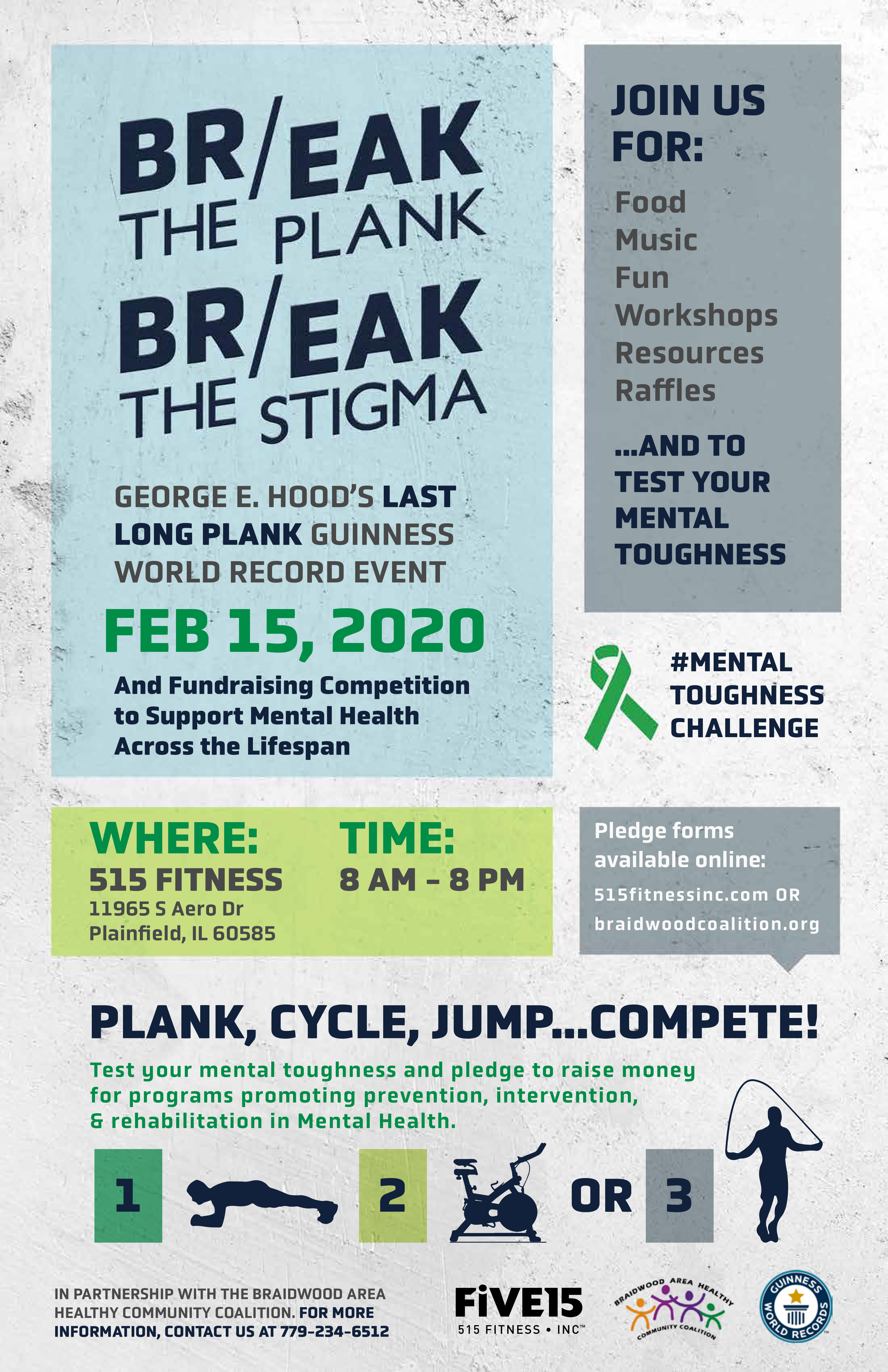 The Braidwood Area Healthy Community Coalition (BAHCC) is partnering with 515 Fitness Inc. to host world-renowned George Hood in his last Guinness World Record long plank attempt on Saturday, February 15, 2020 at 515 Fitness Inc., 11965 S. Aero Dr., Unit A,  Plainfield, IL 60585 in support of mental health across the lifespan.